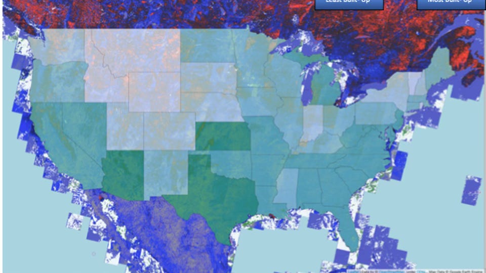Picture of ROY’s Algorithm in Practice: This picture shows the change in the built environment for Quarter 4, 2015 utilizing the ROY remote sensing algorithm. This picture is then translated into a proprietary numerical dataset by state, and combined with traditional economic data in order to predict Core GDP in real time. This image demonstrates that Texas, Arizona and, surprisingly, Kansas had some of the strongest growth in urbanicity during this period.