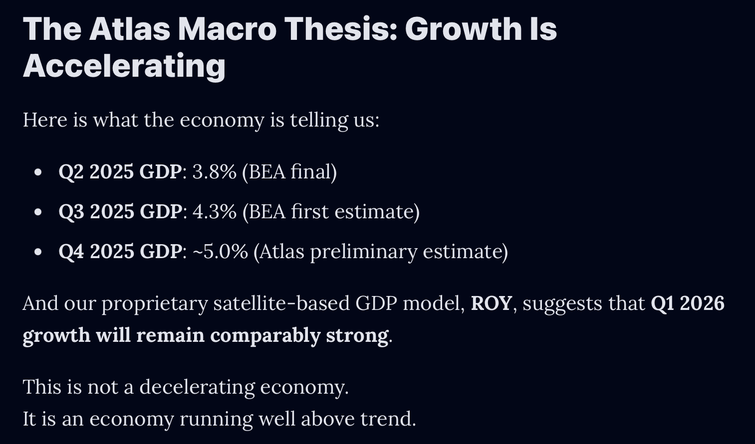 Our satellite data points to approximately +5.0% growth in Q4 2025. While the official advance release was delayed by last fall’s government shutdown, the quarter is complete and the signal is already clear.