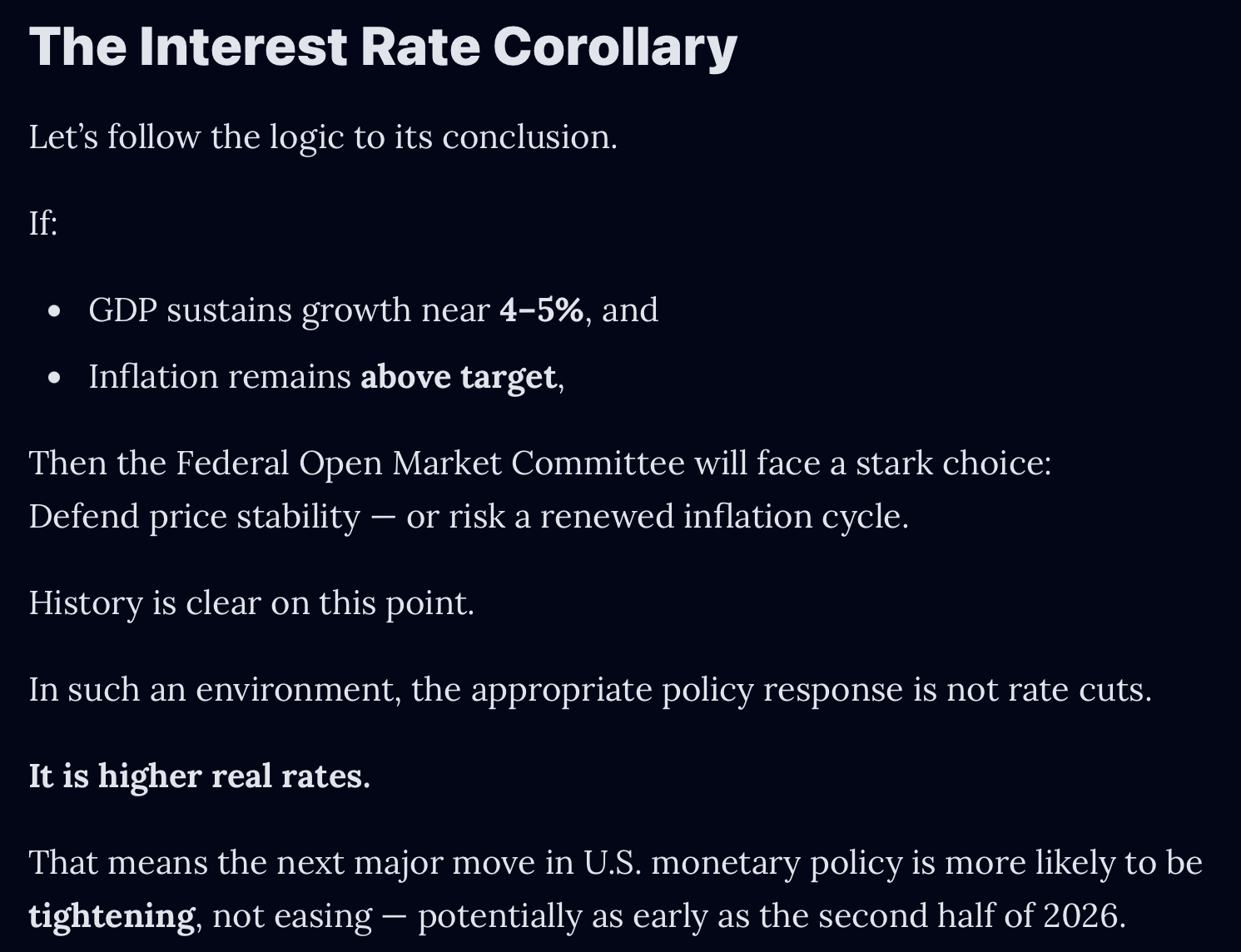 Not today, not next month, but – if the data comes in as strong as we expect – the conversation in the FOMC will shift by the summer, introducing the possibility of a rate hike in the fall of 2026 or the winter of 2027.
