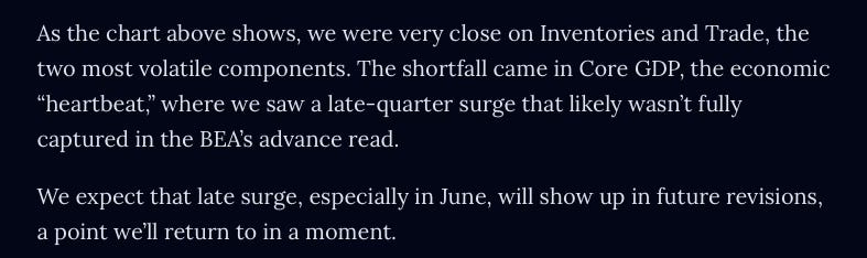 “The shortfall came in Core GDP, the economic ‘heartbeat,’ where we saw a late-quarter surge that likely wasn’t fully captured in the BEA’s advance read. We expect that late surge, especially in June, will show up in future revisions…”
