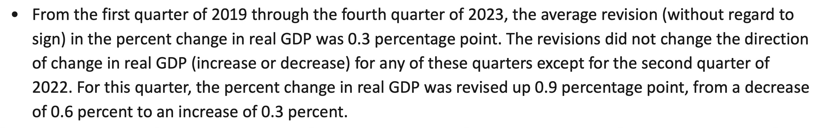 The BEA's Number Is the First Estimate and Almost Certainly Will Be Revised: Last quarter, the BEA revised GDP up by 0.3 percentage points (from 2.8% to 3.1%). The BEA itself states that GDP's average revision is 0.3 percentage points, and, given the extraordinary nature of the trade and inventories numbers in December, this quarter will be revised by even more.