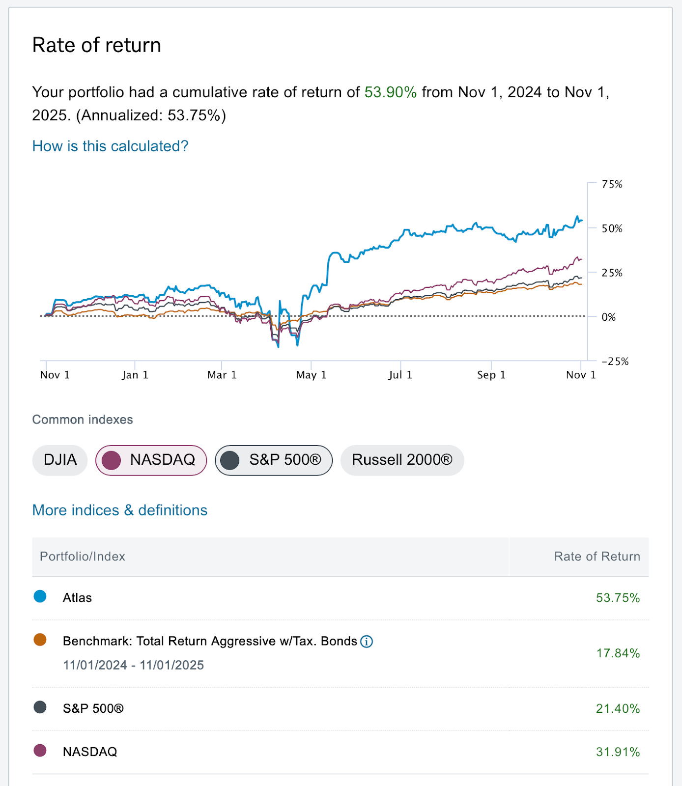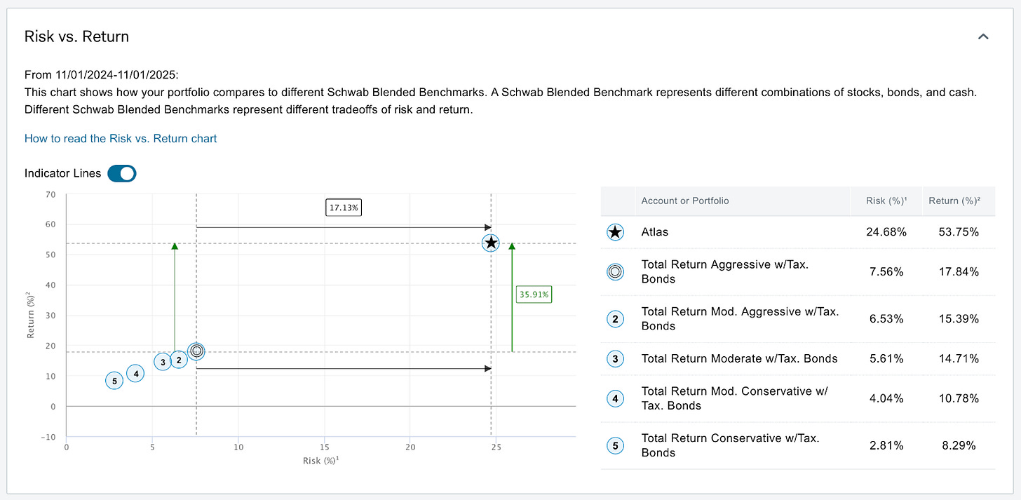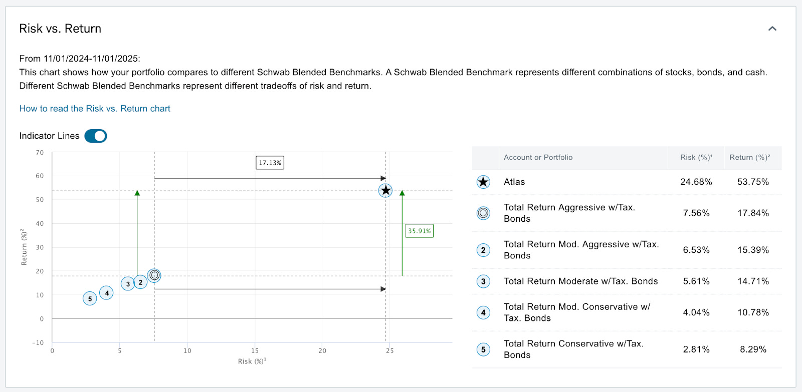 Source: Atlas Analytics’ Schwab Account (Nov. 1, 2024 through Nov. 1, 2025)