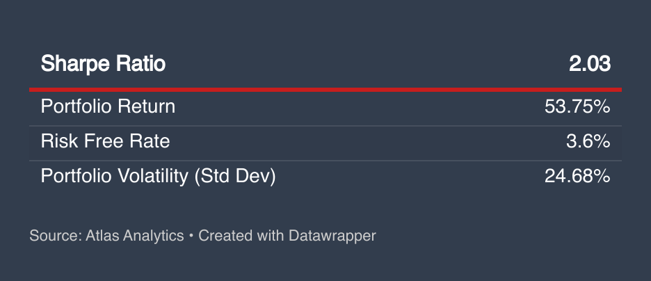 I’ve been trading live on Atlas Analytics’ model for the past year and a half. The results so far: Since November 2024, our portfolio is up +53.75% with an annualized volatility of 24.68% and a Sharpe ratio of 2.03. This isn’t back tested; this is capital at risk.